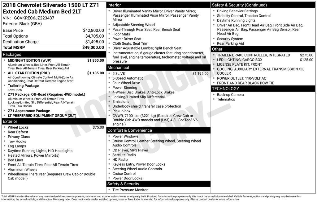 6-Speed Automatic Electronic with Overdrive, 4WD, Black Cloth, 10-Way Power Driver's Seat Adjuster, 110-Volt AC Power Outlet, 4.2 Diagonal Color Display Driver Info Center, 6 Speaker Audio System, All Star Edition, AM/FM radio: SiriusXM, Auxiliary External Transmission Oil Cooler, Brake assist, CD player, Chevrolet w/4G LTE, Color-Keyed Carpeting w/Rubberized Vinyl Floor Mats, Deep-Tinted Glass, Delay-off headlights, Dual-Zone Automatic Climate Control, Electric Rear-Window Defogger, Front Center Armrest w/Storage, Fully automatic headlights, HD Radio, High-Intensity Discharge Headlights, Integrated Trailer Brake Controller, Leather Wrapped Steering Wheel w/Cruise Controls, Manual Tilt/Telescoping Steering Column, Radio: AM/FM 8 Diagonal Color Touch Screen, Rear 60/40 Folding Bench Seat (Folds Up), Remote Keyless Entry, Remote Vehicle Starter System, SiriusXM Satellite Radio, Spray-On Pickup Box Bed Liner, Steering Wheel Audio Controls, Steering wheel mounted audio controls, Theft Deterrent System (Unauthorized Entry), Thin Profile LED Fog Lamps, Trailering Package.