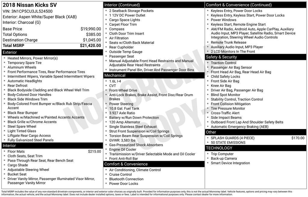 Aspen White/Super Black 2018 Nissan Kicks SV FWD 1.6L 4-Cylinder DOHC 16V CVT with Xtronic