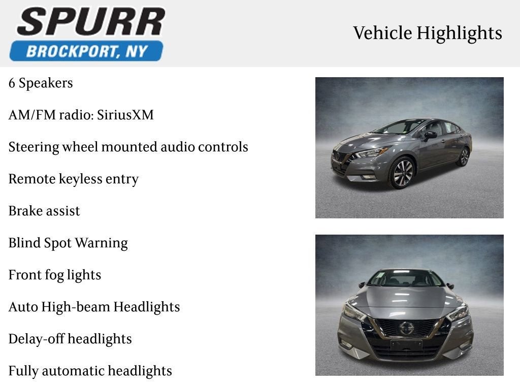 6 Speakers, AM/FM radio: SiriusXM, Auto High-beam Headlights, Blind Spot Warning, Brake assist, Delay-off headlights, Front Bucket Seats, Front fog lights, Fully automatic headlights, Heated door mirrors, Leather steering wheel, NissanConnect featuring Apple CarPlay and Android Auto, Remote keyless entry, Steering wheel mounted audio controls.
