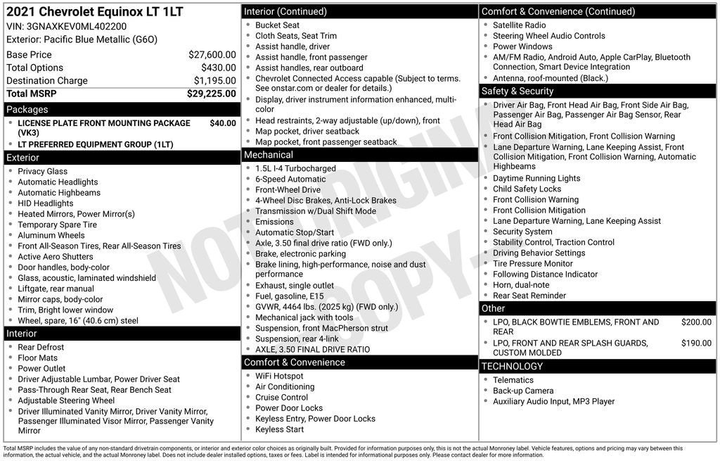 2-Way Power Driver Lumbar Control Seat Adjuster, 6 Speakers, 8-Way Power Driver Seat Adjuster, AM/FM radio: SiriusXM, Auto High-beam Headlights, Bluetooth® For Phone, Brake assist, Custom Molded Front & Rear Splash Guards (LPO), Delay-off headlights, Emergency communication system: OnStar and Chevrolet connected services capable, Front & Rear Black Bowtie Emblems (LPO), Front Bucket Seats, Front Passenger 4-Way Manual Seat Adjuster, Fully automatic headlights, High-Intensity Discharge Headlights, Preferred Equipment Group 1LT, Premium Cloth Seat Trim, Rear seat center armrest, Remote keyless entry, Steering wheel mounted audio controls, Telescoping steering wheel.