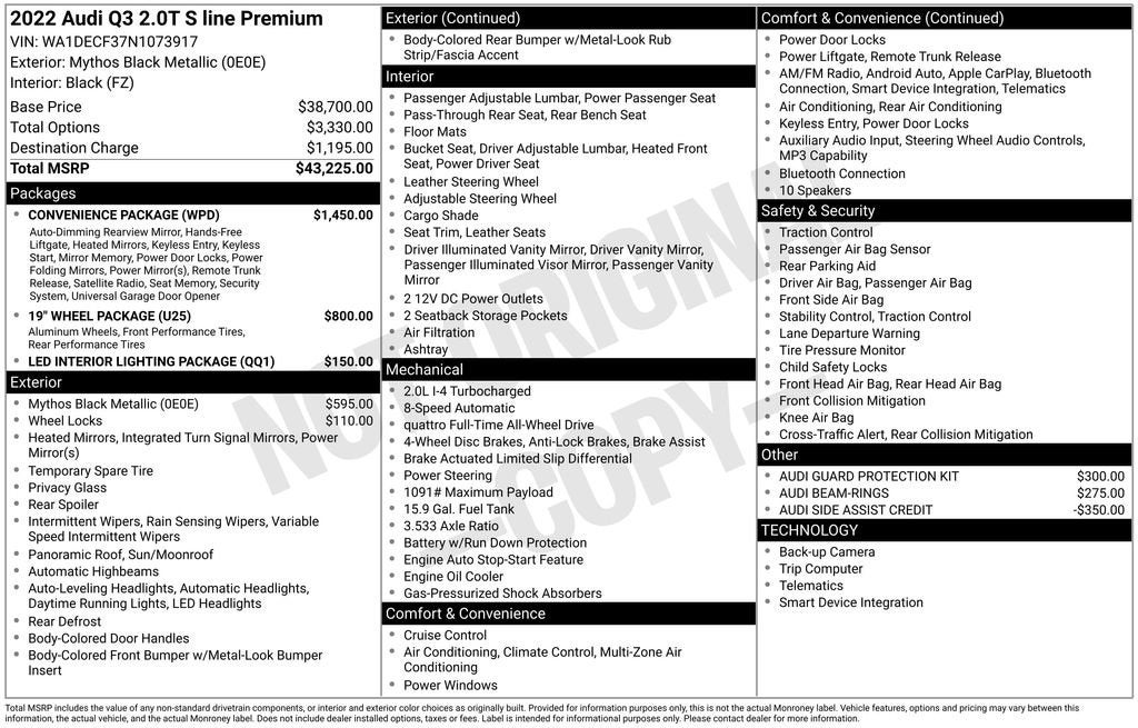 10 Speakers, 19 Wheel Package, Alarm w/Motion Sensor, AM/FM radio, Audi Advanced Key, Audi Beam-Rings, Audi smartphone interface (Apple CarPlay/Android Auto), Auto High-beam Headlights, Brake assist, Convenience Package, Delay-off headlights, Driver Memory, Emergency communication system: Audi connect CARE, Frameless Auto-Dimming Interior Mirror w/Compass, Front Center Armrest, Front dual zone A/C, Front fog lights, Fully automatic headlights, Heated door mirrors, Heated Front Bucket Seats, Heated Power-Folding Exterior Mirrors, HomeLink Garage Door Opener, Leather Seating Surfaces, Leather steering wheel, LED Interior Lighting Package, Power driver seat, Power Liftgate, Power moonroof: Panoramic, Power passenger seat, Rain sensing wipers, Remote keyless entry, SiriusXM All Access Service, Steering wheel mounted audio controls, Wheels: 18 5-V-Spoke-S Design, Wheels: 19 5-Double-Spoke Dynamic Design.