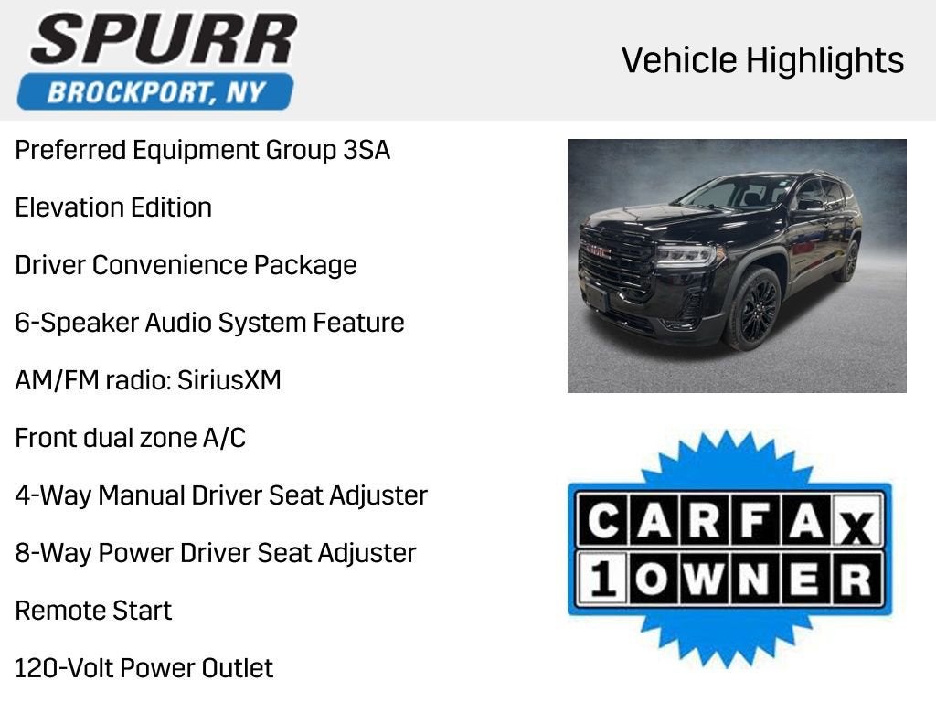 AWD, Jet Black Cloth, 120-Volt Power Outlet, 20 Machined Aluminum Wheels, 4-Way Manual Driver Seat Adjuster, 4-Way Manual Passenger Seat Adjuster, 6-Passenger (2-2-2 Seating Configuration), 6-Speaker Audio System Feature, 8-Way Power Driver Seat Adjuster, AM/FM radio: SiriusXM, Apple CarPlay/Android Auto, Auto High-beam Headlights, Brake assist, Brushed Aluminum Roof Rails, Delay-off headlights, Driver Convenience Package, Elevation Edition, Emergency communication system: OnStar and GMC connected services capable, Front Bucket Seats, Front Center Armrest, Front dual zone A/C, Fully automatic headlights, Gloss Black Roof Rails, Hands Free Power Programmable Liftgate, Heated door mirrors, Heated Driver & Front Passenger Seats, Power Driver Lumbar Control Seat Adjuster, Preferred Equipment Group 3SA, Remote keyless entry, Remote Start, Steering wheel mounted audio controls, Telescoping steering wheel, Wireless Apple CarPlay/Wireless Android Auto.