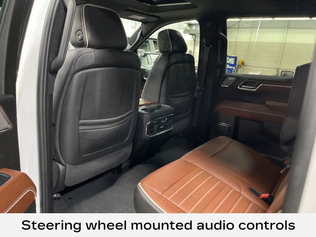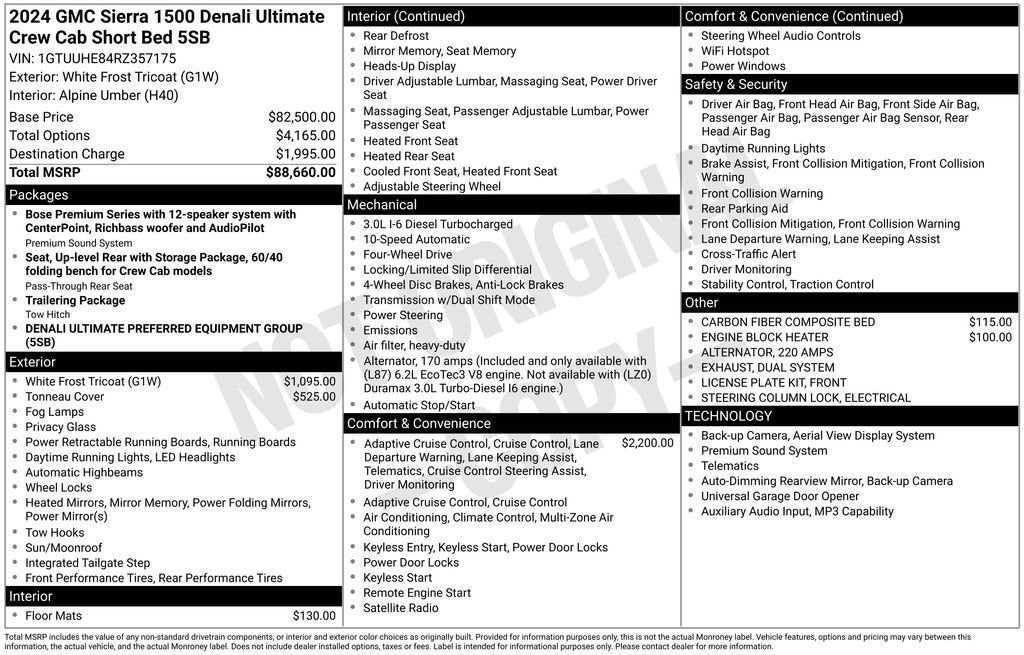 10-Speed Automatic, 4WD, Alpine Umber Leather, 12 Speakers, 120-Volt Bed Mounted Power Outlet, 120-Volt Interior Power Outlet, 16-Way Power Driver Seat Adjuster w/Lumbar, 16-Way Power Passenger Seat Adjuster w/Lumbar, 2 Charge/Data USB Ports Inside Center Console, 2 Type-C Charge-Only Rear USB Ports, 2 USB Ports, Advantage Tri-Fold Soft Tonneau Cover (LPO), AM/FM radio: SiriusXM with 360L, Apple CarPlay/Android Auto, Auto High-beam Headlights, Auto-dimming door mirrors, Auto-dimming Rear-View mirror, Auto-Locking Rear Differential, Bed View Camera, Bose Premium Series w/12-Speaker System, Brake assist, Bumpers: body-color, Carbon Fiber Composite Bed, Chrome Recovery Hooks, Color-Keyed Carpeting Floor Covering, Deep-Tinted Glass, Delay-off headlights, Denali Premium Suspension w/Adaptive Ride Control, Driver Memory, Dual Active Exhaust, Electric Rear-Window Defogger, Floor-Mounted Center Console, Following Distance Indicator, Forward Collision Alert, Front Bucket Seats, Front Center Armrest, Front dual zone A/C, Front fog lights, Front Pedestrian Braking, Front Rain-Sensing Wipers, Full Grain Leather Seat Trim, Fully automatic headlights, Garage door transmitter, GMC Connected Access Capable, HD Surround Vision, Heads-Up Display, Heated 2nd Row Outboard Seats, Heated door mirrors, Heated Driver & Front Outboard Passenger Seating, Heated steering wheel, Heavy-Duty Air Filter, Hill Descent Control, Hitch Guidance, Hitch View, In-Vehicle Trailering System App, Integrated Trailer Brake Controller, IntelliBeam Automatic High Beam On/Off, Keyless Open & Start, Lane Keep Assist w/Lane Departure Warning, LED Cargo Area Lighting, Multicolor 15 Diagonal Head-Up Display, MultiPro Tailgate Audio System by Kicker (LPO), Navigation System, OnStar & GMC Connected Services Capable, Perimeter Lighting, Power Door Locks, Power Front Passenger Windows w/Express Up/Down, Power Front Windows w/Driver Express Up/Down, Power Rake & Telescoping Steering Column, Power Rear Windows w/Express Down, Power Sliding Rear Window w/Rear Defogger, Power Sunroof, Preferred Equipment Group 5SB, Push Button Start, Rain sensing wipers, Rear Cross Traffic Braking, Rear Pedestrian Detection, Rear Wheelhouse Liners, Remote keyless entry, Remote Vehicle Starter System, Safety Alert Seat, SiriusXM w/360L, Split folding rear seat, Spray-On Pickup Bedliner w/Denali Logo, Steering Wheel Audio Controls, Steering wheel mounted audio controls, Theft Deterrent System (Unauthorized Entry), Trailer Camera Provisions, Trailer Side Blind Zone Alert, Trailer Tire Pressure Monitor System, Trailering Package, Ultrasonic Front & Rear Park Assist, Universal Home Remote, Vader Chrome Header w/Signature Denali Grille, Ventilated Driver & Front Passenger Seats, Wheels: 22 7-Spoke Ultra-Bright Machined, Wi-Fi Hotspot Capable, Wireless Apple CarPlay/Wireless Android Auto, Wireless Charging.