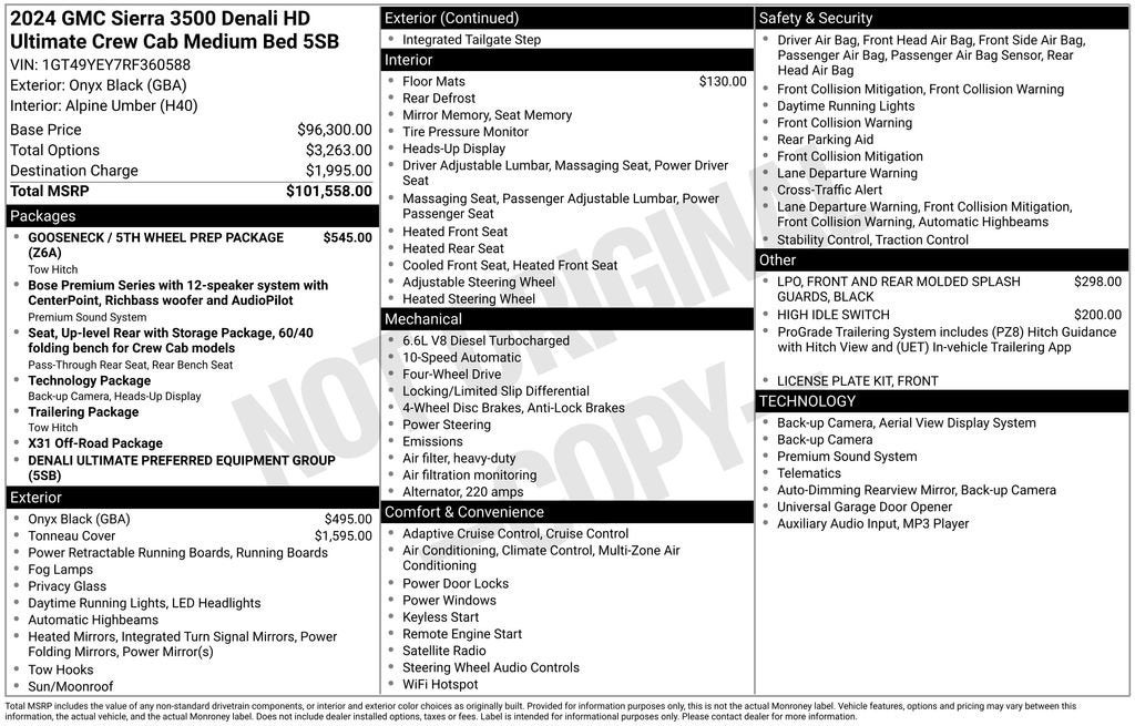 10-Speed Automatic, 4WD, Alpine Umber Leather, 12 Speakers, 120-Volt Bed Mounted Power Outlet, 120-Volt Instrument Panel Power Outlet, 16-Way Power Driver Seat Adjuster w/Lumbar, 16-Way Power Passenger Seat Adjuster w/Lumbar, 2 Charge-Only Rear USB Ports, 2 Charge/Data USB Ports Inside Center Console, 2 USB Ports, 2-Speed Active Transfer Case, 220 Amp Alternator, AM/FM radio: SiriusXM with 360L, Apple CarPlay/Android Auto, Auto High-beam Headlights, Auto-dimming door mirrors, Auto-Dimming Inside Rearview Mirror w/Camera, Automatic Emergency Braking, Bed View Camera w/2 Trailer Camera Provisions, Black Front & Rear Molded Splash Guards (LPO), Block heater, Bose Premium Series 12-Speaker System, Brake assist, Deep-Tinted Glass, Delay-off headlights, Driver Memory, Electric Rear-Window Defogger, Emergency communication system: OnStar and GMC connected services capable, Floor-Mounted Center Console, Following Distance Indicator, Forward Collision Alert, Front Bucket Seats, Front Center Armrest, Front dual zone A/C, Front fog lights, Front Pedestrian Braking, Front Rain-Sensing Wipers, Full Grain Leather Seat Trim, Fully automatic headlights, Gooseneck/5th Wheel Prep Package, Hard-Folding Tonneau Cover (LPO), HD Surround Vision, Heads-Up Display, Heated 2nd Row Outboard Seats, Heated door mirrors, Heated Driver & Front Outboard Passenger Seats, Heated steering wheel, High Idle Switch, Hill Descent Control, Hitch Guidance w/Hitch View, In-Vehicle Trailering App, Integrated Trailer Brake Controller, IntelliBeam Automatic High Beam On/Off, Keyless Open & Start, Lane Departure Warning System, LED Cargo Area Lighting, LED Smoked Amber Roof Marker Lamps, Manual Tilt-Wheel/Telescoping Steering Column, Multicolor 15 Diagonal Head-Up Display, Off-Road Suspension, Power driver seat, Power Front Windows w/Passenger Express Up/Down, Power Sliding Rear Window w/Defogger, Power Sunroof, Preferred Equipment Group 5SB, Prem Front Floor Liners w/Removable Carpet Insert, Prem Rear Floor Liners w/Removable Carpet Insert, ProGrade Trailering System, Push Button Start, Rain sensing wipers, Rear Cross Traffic Alert, Rear step bumper, Rear Wheelhouse Liners, Remote keyless entry, Remote Vehicle Starter System, Safety Alert Seat, Signature Denali Grille in Vader Chrome, SiriusXM w/360L, Snow Plow Prep/Camper Package, Spray-On Pickup Bedliner w/Denali Logo, Steering Wheel Audio Controls, Steering wheel mounted audio controls, Technology Package, Trailer Camera Provisions, Trailer Side Blind Zone Alert, Trailer Tire Pressure Monitor Sensors, Turn signal indicator mirrors, Ultrasonic Front & Rear Park Assist, Unauthorized Entry Theft-Deterrent System, Universal Home Remote, Ventilated Driver & Front Passenger Seats, Wheels: 20 Ultra-Bright Machined Aluminum, Wireless Charging, Wireless Phone Projection, X31 Off-Road Package.