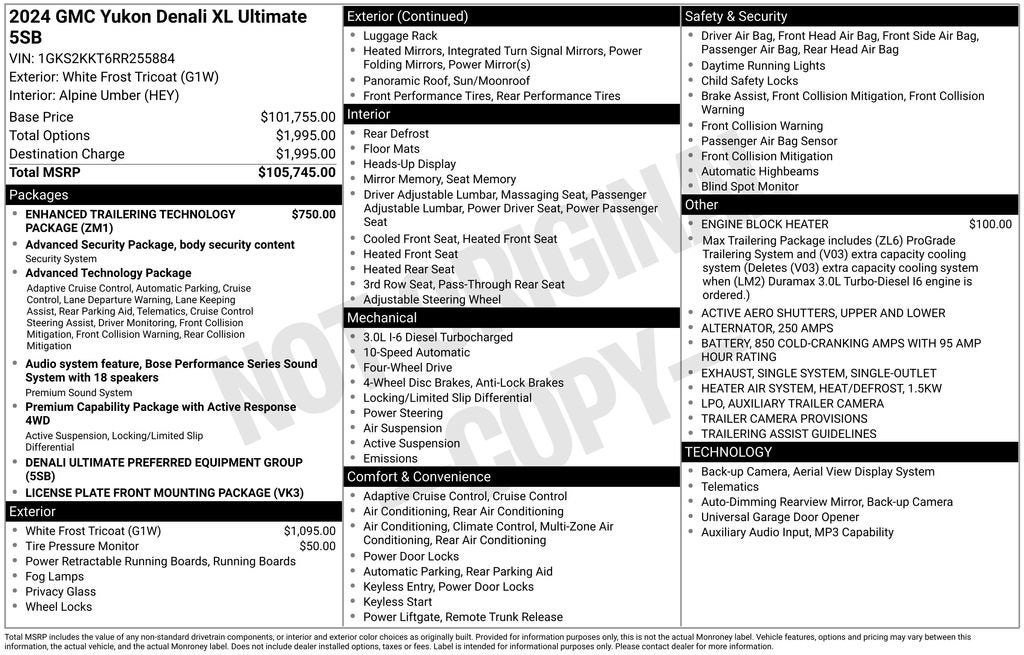 4WD, 15 Diagonal Multi-Color Head-Up Display, 16-Way Power Seat Adjusters, 18 Speakers, 2 Presets For Outside Rearview Mirrors, 3rd Row 60/40 Power-Folding Split-Bench Seat, 850 Cold-Cranking Amps Battery, Adaptive Cruise Control, Adaptive suspension, Advanced Security Package, Advanced Technology Package, Apple CarPlay/Android Auto, Auto High-beam Headlights, Auto-dimming door mirrors, Auto-dimming Rear-View mirror, Auto-leveling suspension, Bose Performance Series Sound System w/18 Speakers, Brake assist, Bright Front & Rear Door Sill Plates, Chrome Door Handles w/Body-Color Strip, Delay-off headlights, Diesel B20 Fuel, Dual Exhaust System, Dual-Pane Panoramic Power Sunroof, Emergency communication system: OnStar and GMC connected services capable, Enhanced Automatic Emergency Braking, Enhanced Automatic Parking Assist, Enhanced Trailering Technology Package, Extra Capacity Cooling System, Floor Console, Front Bucket Seats, Front Center Armrest, Front fog lights, Full Grain Leather Seats, Fully automatic headlights, Garage door transmitter, Glass Breakage Sensor, Hands-Free Power Programmable Rear Liftgate, HD Surround Vision, Heads-Up Display, Heated 2nd Row Outboard Position Seats, Heated door mirrors, Heated Driver & Front Passenger Seats, Heated Steering Wheel, Hill Descent Control, Hitch View, Inside Rearview Auto-Dimming Rear Camera Mirror, Integrated Trailer Brake Controller, Leather-Wrapped Steering Wheel, Magnetic Ride Control Suspension, Max Trailering Package, Memory seat, Navigation System, Outside Heated Power-Adjustable Mirrors, Perforated Heated & Ventilated Dr & Frt Pass Seats, Power driver seat, Power Liftgate, Power Release 2nd Row Bucket Seats, Power Tilt & Telescopic Steering Column, Power-Retractable Assist Steps, Preferred Equipment Group 5SB, Rain sensing wipers, Rear audio controls, Rear Camera Mirror Washer, Rear Cross Traffic Alert, Rear Pedestrian Alert, Rear Seat Media System, Remote keyless entry, Reverse Automatic Braking, Safety Alert Seat, Smart Trailer Integration Indicator, Sport Pedal Cover Kit (LPO), Steering wheel memory, Steering wheel mounted audio controls, Super Cruise, Theft-Deterrent Alarm System, Trailer Camera Provisions, Trailer Side Blind Zone Alert, Trailer Tire Pressure Monitor Sensors, Trailering Assist Guidelines, Turn signal indicator mirrors, Universal Home Remote, Upper & Lower Active Aero Shutters, Vader Bodyside Moldings, Vehicle Inclination Sensor, Vehicle Interior Movement Sensor, Wheel Locks (Set of 4) (LPO), Wheels: 22 7-Spoke Ultra-Bright Machined, Wired Auxiliary Trailer Camera (LPO), Wireless Charging.