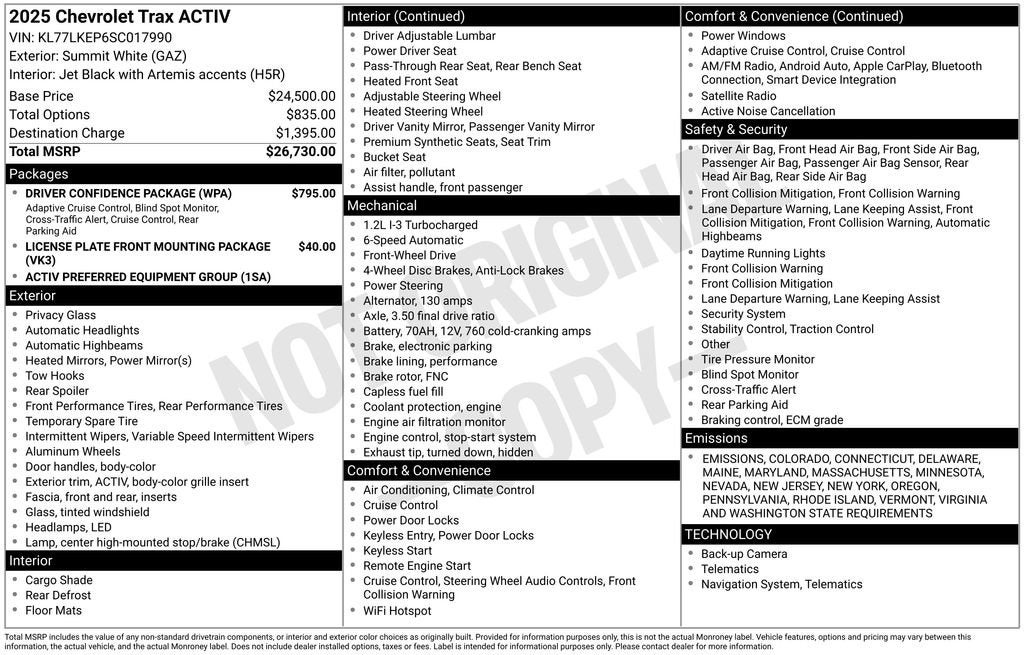 6-Speaker Audio System Feature, 8-Way Power Driver Seat Adjuster, Adaptive Cruise Control, AM/FM radio: SiriusXM, Auto High-beam Headlights, Brake assist, Bumpers: body-color, Delay-off headlights, Driver Confidence Package, Emergency communication system: OnStar One Essentials, Evotex Seat Trim, Front Bucket Seats, Front Center Armrest, Fully automatic headlights, Heated door mirrors, Heated front seats, Heated steering wheel, Leather steering wheel, Preferred Equipment Group 1SA, Rear Cross-Traffic Alert, Rear Park Assist, Remote keyless entry, Wheels: 18 Black-Painted Aluminum.