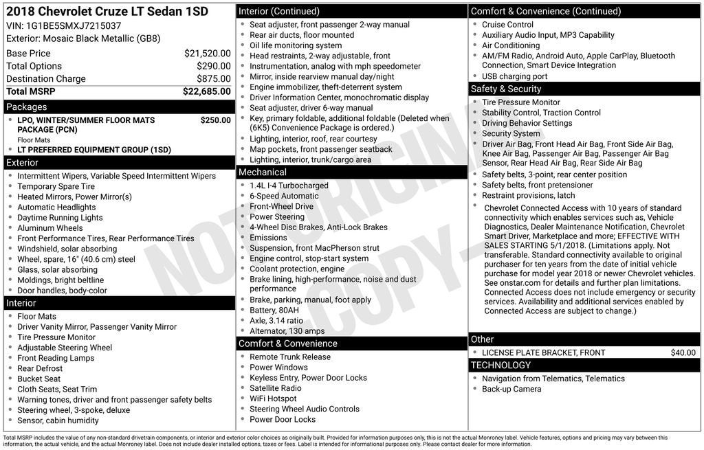 Mosaic Black Metallic 2018 Chevrolet Cruze LT FWD 1.4L 4-Cylinder Turbo DOHC CVVT 6-Speed Automatic