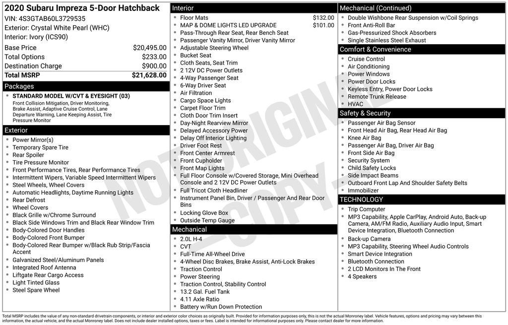 Crystal White Pearl 2020 Subaru Impreza Base AWD 2.0L DOHC CVT Lineartronic