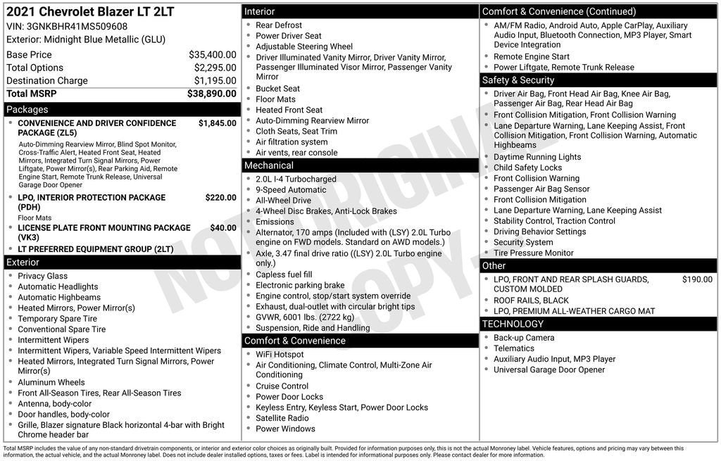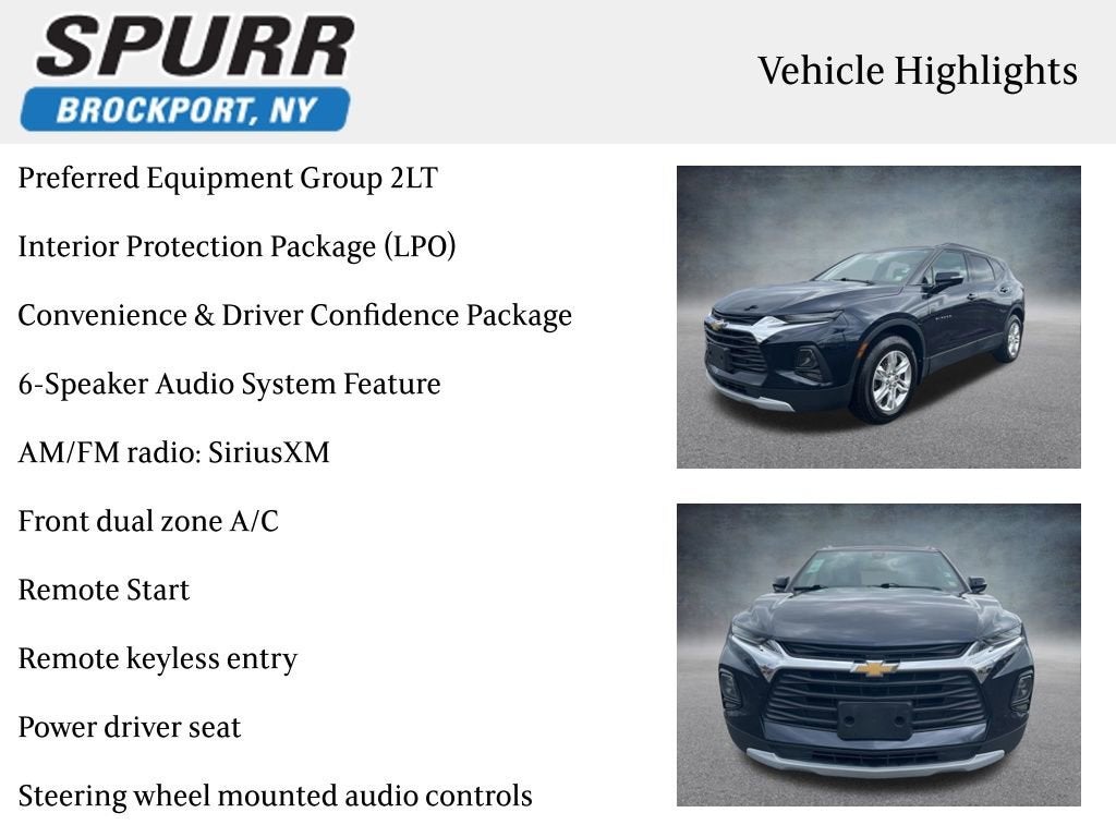 Priced below KBB Fair Purchase Price! Odometer is 17273 miles below market average!AWD, 6-Speaker Audio System Feature, AM/FM radio: SiriusXM, Apple CarPlay/Android Auto, Auto High-beam Headlights, Black Roof Rails, Brake assist, Convenience & Driver Confidence Package, Delay-off headlights, Emergency communication system: OnStar and Chevrolet connected services capable, Front & Rear Custom Molded Splash Guards, Front Bucket Seats, Front Center Armrest, Front dual zone A/C, Fully automatic headlights, Heated Driver & Front Passenger Seats, High-Intensity Discharge Headlights, Inside Rear-View Auto-Dimming Mirror, Interior Protection Package (LPO), Lane Change Alert w/Side Blind Zone Alert, Outside Heated Power-Adjustable Body-Color Mirrors, Power driver seat, Preferred Equipment Group 2LT, Premium All-Weather Cargo Mat (LPO), Premium All-Weather Floor Mats, Rear Cross Traffic Alert, Rear Park Assist w/Audible Warning, Rear Power Programmable Liftgate, Remote keyless entry, Remote Start, Steering wheel mounted audio controls, Telescoping steering wheel, Universal Home Remote.Midnight Blue Metallic 2021 Chevrolet Blazer LT AWD 2.0L Turbocharged 9-Speed Automatic22/27 City/Highway MPGPlease reach out to us at: 585-637-3999 to see how we will provide a SPURR-tacular purchase and ownership experience!Awards:* JD Power Automotive Performance, Execution and Layout (APEAL) Study
