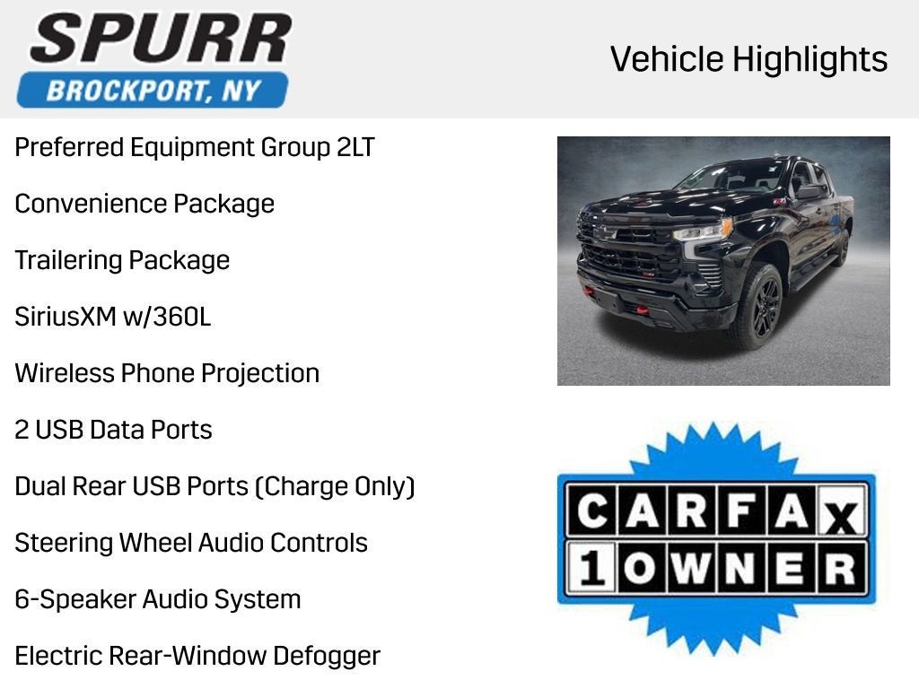 10-Speed Automatic, 4WD, Black Cloth, 10-Way Power Driver Seat w/Lumbar, 12.3 Multicolor Reconfigurable Digital Display, 120-Volt Bed Mounted Power Outlet, 120-Volt Instrument Panel Power Outlet, 2 USB Data Ports, 6-Speaker Audio System, All-Weather Floor Liner (LPO) (AAK), Apple CarPlay/Android Auto, Auto High-beam Headlights, Auto-Locking Rear Differential, Automatic Emergency Braking, Auxiliary External Transmission Oil Cooler, Bluetooth® For Phone, Brake assist, Chevrolet Connected Access Capable, Color-Keyed Carpeting Floor Covering, Compass, Convenience Package, Deep-Tinted Glass, Delay-off headlights, Dual Exhaust w/Polished Outlets, Dual Rear USB Ports (Charge Only), Dual-Zone Automatic Climate Control, Electric Rear-Window Defogger, Electrical Steering Column Lock, Electronic Cruise Control, Electronic Transmission Range Selector Shifter, EZ Lift Power Lock & Release Tailgate, Floor Mounted Center Console, Following Distance Indicator, Forward Collision Alert, Front Bucket Seats, Front Center Armrest w/Storage, Front dual zone A/C, Front fog lights, Front LED Fog Lamps, Front Pedestrian Braking, Fully automatic headlights, HD Rear Vision Camera, Heated door mirrors, Heated Driver & Front Outboard Passenger Seats, Heated Power-Adjustable Outside Mirrors, Heated Steering Wheel, High Gloss Black Mirror Caps, Hitch Guidance, Inside Rear-View Mirror w/Tilt, IntelliBeam Automatic High Beam On/Off, Keyless Open & Start, Leather Wrapped Steering Wheel, LED Cargo Area Lighting, Manual Tilt/Telescoping Steering Column, OnStar & Chevrolet Connected Services Capable, Performance Red Recovery Hooks, Power Front Windows w/Driver Express Up/Down, Power Front Windows w/Passenger Express Down, Power Rear Windows w/Express Down, Preferred Equipment Group 2LT, Rear 60/40 Folding Bench Seat (Folds Up), Rear step bumper, Remote keyless entry, Remote Vehicle Starter System, SiriusXM w/360L, Standard Tailgate, Steering Wheel Audio Controls, Theft Deterrent System (Unauthorized Entry), Trailering Package, Wheels: 20 x 9 High Gloss Black Painted Alum, Wi-Fi Hot Spot Capable, Wireless Charging, Wireless Phone Projection.